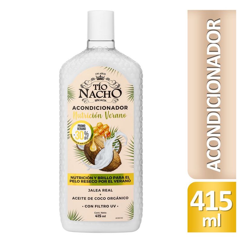 Tio Nacho Acondicionador Nutricion Verano ofrece un tratamiento exclusivo para el cabello durante el verano, ya que el calor, el cloro, la sal y los rayos UV pueden resecar tu pelo, dejandolo opaco, con frizz, con las puntas abiertas y sin vida.Con una delicada combinacion de Jalea Real y Aceite de Coco 100% Organico, Tio Nacho Acondicionador Nutricion Verano aporta la nutricion que tu pelo necesita durante el verano, fortaleciendolo y otorgandole brillo, suavidad y manejabilidad. Contiene filtro UV, protege el pelo y ayuda a controlar el frizz. Sin sulfatos y sin colorantes.