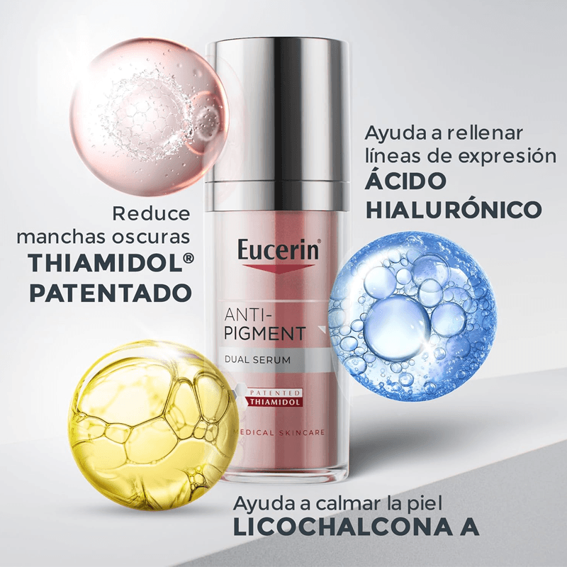 El Sérum facial Eucerin ANTI-PIGMENT de doble acción contiene dos componentes principales: Thiamidol, un ingrediente eficaz que actúa en la raíz de la causa de la hiperpigmentación, previniendo su reaparición al usarlo de modo regular, y Ácido Hialurónico concentrado como una de las sustancias humectantes que ayuda a que la piel conserve y atraiga la humedad. La emulsión reduce las manchas y renueva la apariencia de la piel, logrando que luzca suave, radiante y homogénea. Los primeros resultados son visibles después de dos semanas y es apto para todo tipo de piel. BENEFICIOS - Ayuda a reducir manchas - Renueva la apariencia de la piel - Resultados visibles en dos semanas - La piel luce suave, radiante y homogénea - Apto para todo tipo de piel 1) Limpiar la piel correctamente con el limpiador Eucerin DermatoCLEAN apropiado. 2) Tonificar con Eucerin DermatoCLEAN Tónico facial para preparar la piel 3) Aplicar Eucerin ANTI-PIGMENT Sérum dual facial sobre el rostro, cuello y escote, presionando en el medio de la parte superior del dispensador para asegurarse que salga la misma cantidad de ambos sérums 4) Masajear suavemente y evitar el contacto con los ojos. 5) Para mejores resultados, usar el producto junto con Eucerin Anti Pigment Crema de día y Eucerin Anti Pigment Crema de noche.