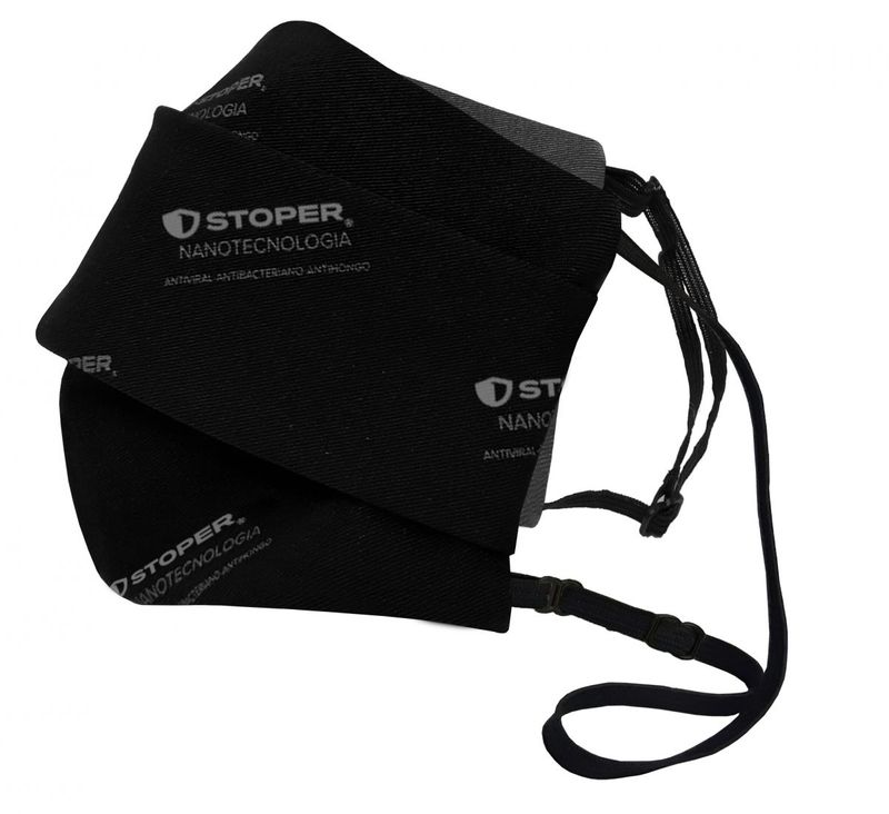 STOPER ANTIBACTERIAL REUTILIZABLE: -Tela 100% poliéster y respirable. -Impregnada con solución de nanopartículas metálicas, diseñadas especialmente para matar virus, bacterias y hongos al contacto, eliminando de esta forma el riesgo de contagio. -3 capas máxima protección (dos capas de tela y una capa translucida hidrofóbica). -Sujetación de orejas regulable (se adapta a tu medida sin necesidad de talles). -Supera más de 30 lavados manteniendo las propiedades bactericidas. -Autoesterilizante, es capaz de dejar el barbijo esterilizado en pocos minutos. -Ensayos aprobados en laboratorios del CONICET.