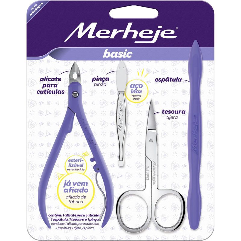 SUJETO A DISPONIBILIDAD DE COLOR La punta de los alicates de acero inoxidable aumenta la durabilidad del producto. Se puede esterilizar a 125ºC durante 01 hora. El juego contiene: 1 alicate para cutículas, 1 espátula, 1 tijera para uñas, 1 pinza. Uso recomendado: Suavizá la cutícula en agua o suavizante. Con los alicates de cutícula MERHEJE BASIC, corte siguiendo la forma de sus uñas. Su afilado especial asegura un corte rápido y preciso. La espátula MERHEJE BASIC garantiza una mejor preparación para las uñas: con la espátula con punta de concha empuja la cutícula, con la espátula con punta de cuchillo raspa la cutícula que normalmente se adhiere a la uña. Las pinzas depilatorias MERHEJE BASIC son adecuadas para dar forma a las cejas. Su punta recta proporciona un gran rendimiento, también desbloquea el cabello fácilmente. Para un mejor rendimiento, use el cortaúñas MERHEJE BASIC justo después del baño. La forma de su cuchilla permite una mayor precisión en el corte de uñas. Composición: Alicates de cutícula: acero inoxidable. Espátula: polipropileno. Pinzas: acero inoxidable. Tijeras para uñas: acero inoxidable