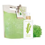 BOX FELICIDAD BAMBU Y LOTO kit de cuidado personal - Jabón líquido aroma de bambú y loto, con extracto de bambú, glicerina y vitamina E. Libre de parabenos. - Esponja verde - Bolsa ecológica