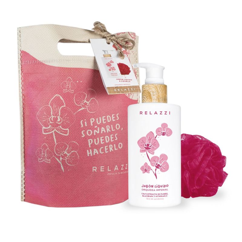BOX FELICIDAD ORQUIDEA IMPERIAL kit de cuidado personal - Jabón líquido aroma de orquídea imperial, con extracto de flores, glicerina y vitamina E. Libre de parabenos. - Esponja fucsia - Bolsa ecológica