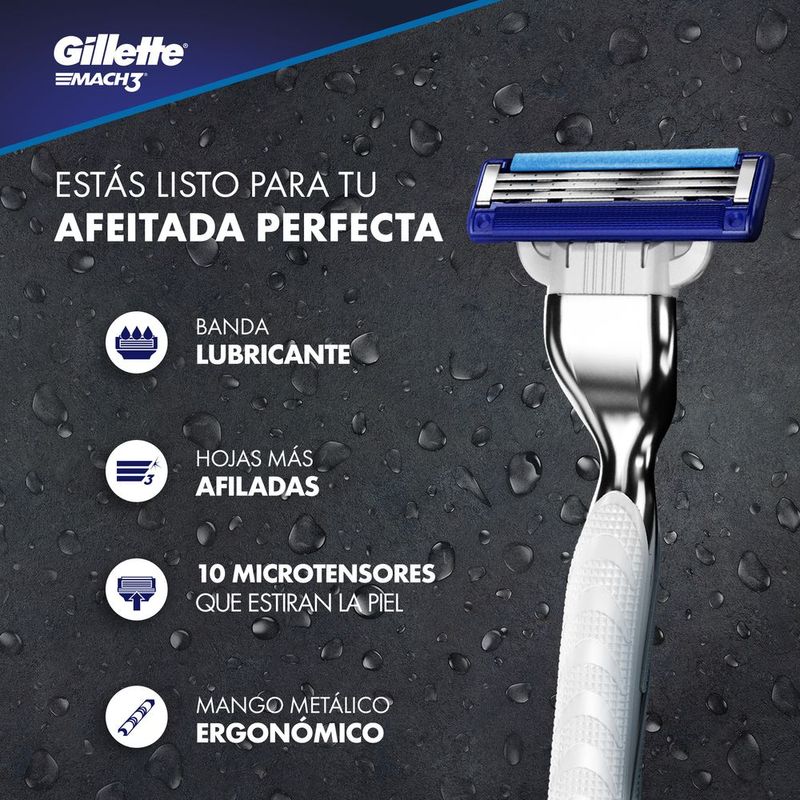 �Sigues usando desechables? Es hora de que cambies a una afeitadora de verdad. Gillette MACH3. Dura hasta 2x mas* que la desechable lider. Despues de 10 afeitadas, sigue siendo mejor que una desechable nueva. Prueba el Gel de Afeitar MACH3 para una mejor afeitada. CARACTERiSTICAS Y BENEFICIOS: Mejor que una desechable, incluso en la 10a afeitada. Cabezal pivotante que ajusta al contorno de tu piel. Banda lubricante para proteger contra el enrojecimiento.Se decolora cuando la afeitada ya no es optima. Hojas mas afiladas* individualmente montadas sobre resortes para confort duradero *dos primeras hojas vs Prestobarba 3. Todos los cartuchos MACH3 se pueden usar con cualquier mango MACH3. Cinco (5) microtensores que alisan la piel para una afeitada uniforme y sin esfuerzo. INDICACIONES: Aplique crema de afeitar y luego deslice la maquina sobre su cara. ADVERTENCIAS: No se deje al alcance de los ninos, producto no perecedero, no exponer a temperaturas mayores a 48�C. *vs Prestobarba Ultragrip