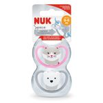 Chupete NUK Space - Orificios de ventilación extra-grandes que permiten una máxima circulación de aire y que la piel respire. Perfecto para piel sensible del bebé. - Con la mejor tetina Ortodóntica NUK para el desarrollo oral saludable del bebé: - Forma natural basada en el pezón materno durante el amamantamiento, que se adapta perfectamente en la boca cuando el bebé succiona. - Cuello de tetina más delgado y angosto; reduce la presión en la mandíbula y los dientes. - Tetina más plana y suave en la parte inferior: más libertad para los movimientos de succión de la lengua. - Disponible en 3 tamaños: 0-6m, 6-18m, 18-36m. - Estuche doble apto para transporte y esterilización. - Presentación: 2 unidades por estuche - Innovadores diseños de animales
