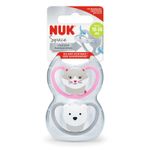 Chupete NUK Space - Orificios de ventilación extra-grandes que permiten una máxima circulación de aire y que la piel respire. Perfecto para piel sensible del bebé. - Con la mejor tetina Ortodóntica NUK para el desarrollo oral saludable del bebé: - Forma natural basada en el pezón materno durante el amamantamiento, que se adapta perfectamente en la boca cuando el bebé succiona. - Cuello de tetina más delgado y angosto; reduce la presión en la mandíbula y los dientes. - Tetina más plana y suave en la parte inferior: más libertad para los movimientos de succión de la lengua. - Disponible en 3 tamaños: 0-6m, 6-18m, 18-36m. - Estuche doble apto para transporte y esterilización. - Presentación: 2 unidades por estuche - Innovadores diseños de animales