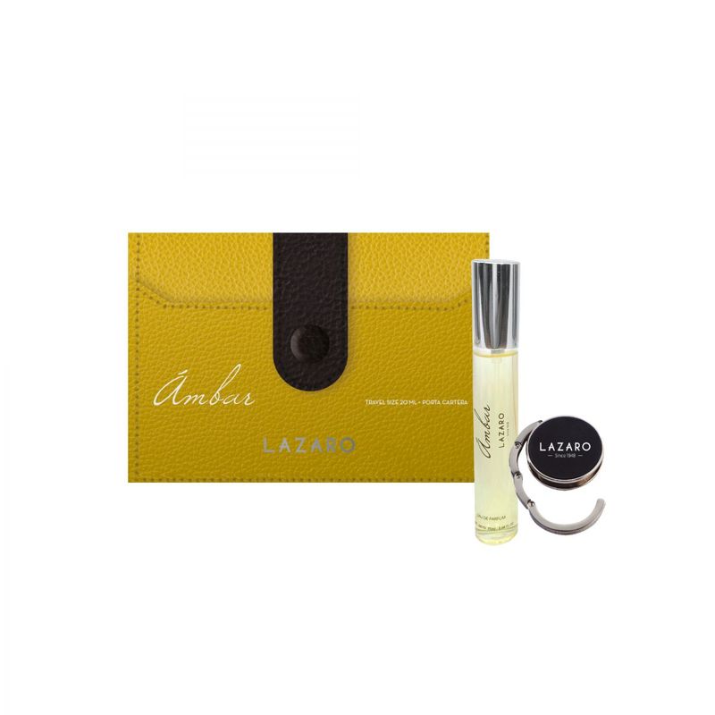 Novedoso y practico set para llevar en todo momento. Tu fragancia favorita en tu cartera. Mini travel size 20ml Ambar + gancho plata portacartera