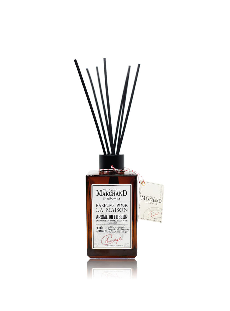 El Jazmín es un ingrediente aromático de los más apreciados y atractivos que hay y recrea un ambiente sensual, elegante y femenino. A su vez tiene cualidades relajantes que producen una sensación de serenidad y bienestar propiciando al equilibrio emocional. El aceite esencial de Jazmín se extrae de la flor de la planta, y se requiere mucha cantidad de sus flores para obtener dosis de su extracto. El aceite de Sándalo tiene la capacidad de influir en nuestro estado de ánimo. Es estimulante y ayuda a restablecer los niveles normales de serotonina creando una sensación de bienestar. A su vez posee propiedades relajantes que recrean un ambiente calmo y acogedor. Esta maridaje de Jazmín y Sándalo hacen de tu hogar un espacio íntimo y sensual. Dejate envolver por estos aromas! Exclusiva botella de vidrio color ambar de 200 ml, varillas color negro, etiqueta enologica, tag con info de la linea, todo dentro de un estuche hecho con compromiso de gestion ambiental. Escaneando el codigo QR del estuche, Christophe te cuenta mas sobre la linea Parfums Pour La Maison de Marchand D´Aromes.
