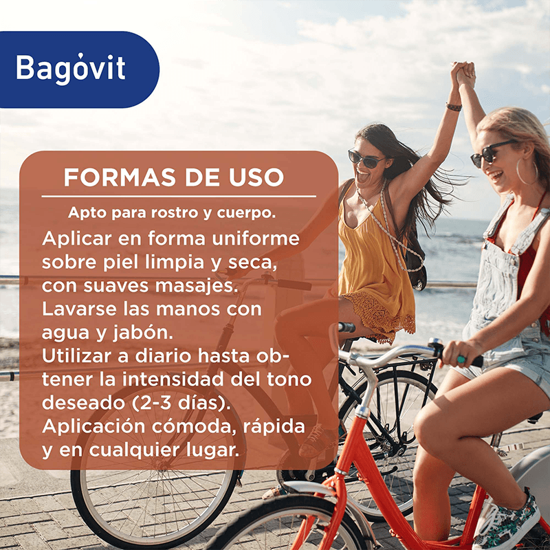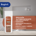 Bagóvit Bronceado Progresivo es una Emulsión Nutritiva Hidratante para cuerpo y rostro, con hidratación continua 24 h. Su fórmula combina DHA, Vitamina A, Ácido Hialurónico y Vitamina E, brindando un bronceado saludable en 3 días. Deja la piel más luminosa, suave y uniforme desde la primera aplicación. Es hipoalergénica y libre de gluten.