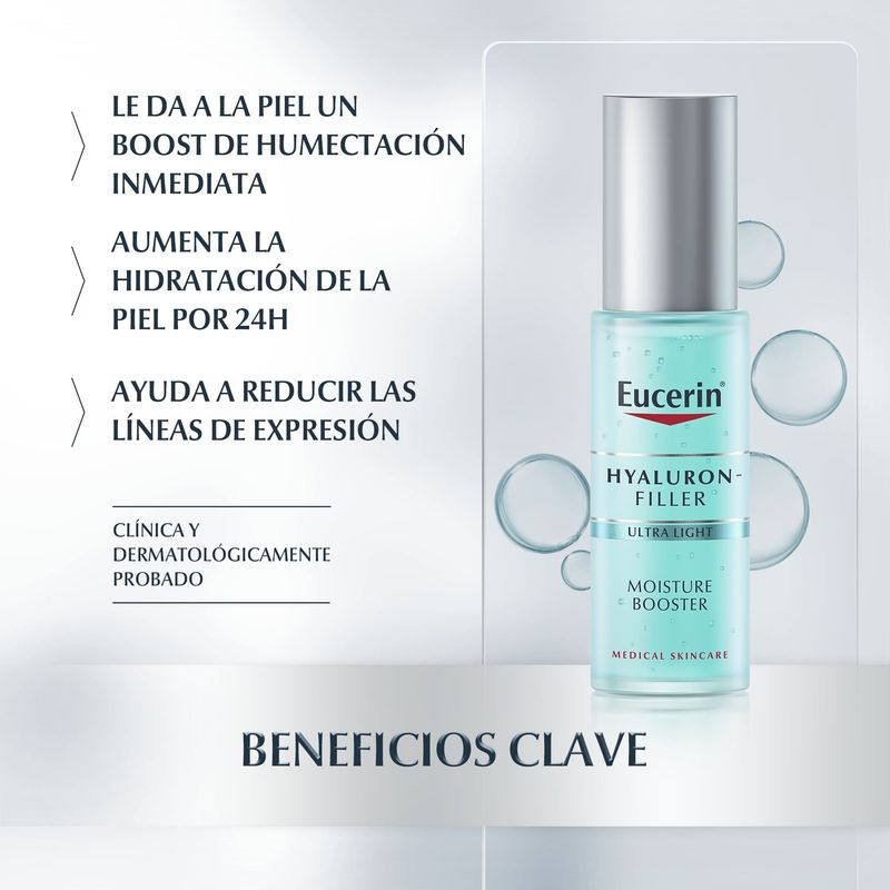 Eucerin Hyaluron-Filler Hydrating Booster está clínica y dermatológicamente comprobado para ofrecer excelentes resultados. El 100% de los encuestados está de acuerdo en que el producto "aumenta la humectación", hace que su piel se sienta "inmediatamente hidratada" y visiblemente "más firme".