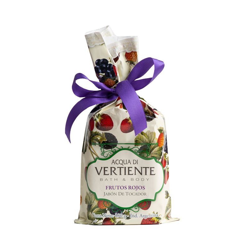 Jabon de tocador para el cuerpo. Con una inconfundible fragancia que reproduce el aroma de los frutos rojos Y viene con una practica bolsa.