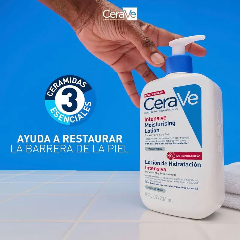 Desarrollada con dermatólogos, la Loción Hidratante Intensiva de CeraVe está formulada con Hydro-Urea™, un complejo único que ayuda a restaurar los factores hidratantes naturales de la piel, 3 ceramidas esenciales, Tecnología MVE y manteca de karité para hidratar intensamente, restaurar y ayudar a reforzar la barrera cutánea.