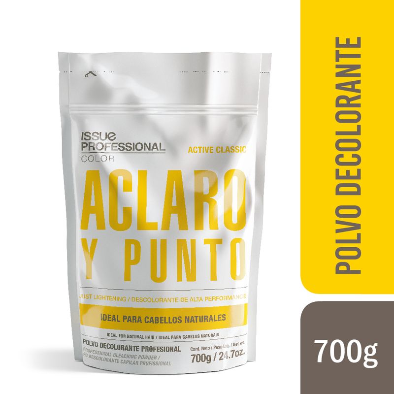 Ideal para cabellos naturalesEl polvo decolorante Active Classic está recomendado para utilizar en cabellos naturales, gruesos, difíciles y resistentes, con colores oscuros hasta una altura 5. MODO DE USO Mezclar una parte de Polvo Decolorante con dos partes de Crema Oxidante Compatible Issue Professional Color en un recipiente plástico no metálico, hasta conseguir una consistencia homogénea. Luego, aplicar sobre cabellos secos y no lavados. Active Classic tiene una acción decolorante gradual desde su aplicación hasta los 60 minutos, según la aclaración que se desee conseguir. Pasado dicho tiempo, enjuagar abundantemente hasta eliminar la crema decolorante por completo, luego lavar con Shampoo Neutro Issue Professional. Siempre recomendamos leer las instrucciones del envase.* Prueba de sensibilidad:Preparar un poco de producto siguiendo las instrucciones de uso. Aplicar en un mechón y piel detrás de la oreja, dejar 30 minutos y enjuagar. No aplicar el producto si a las 48 hs. observa irritación de la piel, picazón, enrojecimiento en la zona de aplicación ó quiebre del cabello.