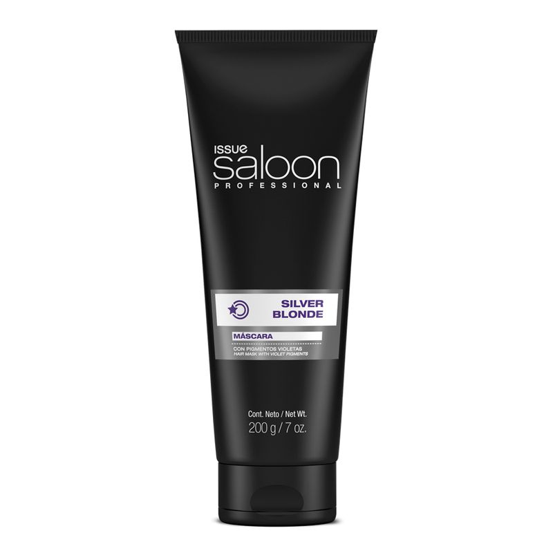 La línea de cuidado capilar Issue Saloon Professional Silver Blonde es ideal para cabellos rubios extra claros.La Máscara Silver Blonde Issue Saloon Professional penetra en la fibra capilar, reparándola y neutralizando los tonos amarillos para lograr un efecto rubio frío. Su exclusiva fórmula con pigmentos violetas concentrados e ingredientes restauradores, elimina los reflejos indeseados y nutre profundamente el cabello, logrando resultados visibles desde el primer uso. Es ideal para matizar cabellos rubios, grises y blancos. MODO DE USO Después de usar el Shampoo Silver Blonde, aplicar una cantidad generosa de Máscara Silver Blonde sobre el cabello, masajeando de raíz a puntas. Dejar actuar de 5 a 10 minutos y enjuagar bien. Se recomienda usar solo una vez por semana, ya que es un producto de matización. Usar shampoo y acondicionador regular entre lavados para evitar la acumulación de color.