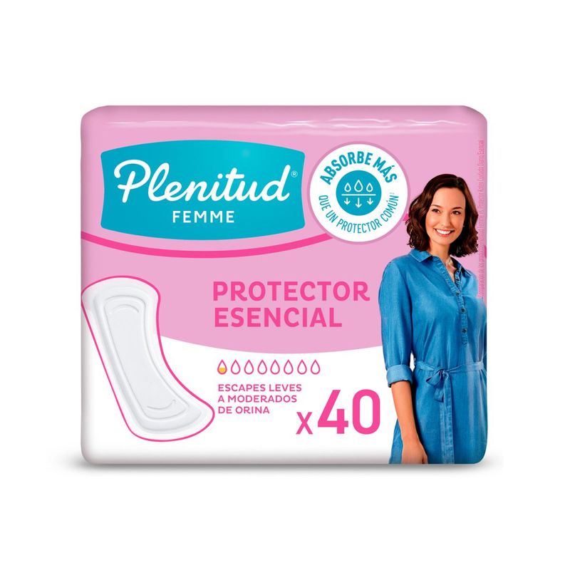 Plenitud Femme protector esencial para escapes de orina. Escapes leves a moderados. Control de olores.