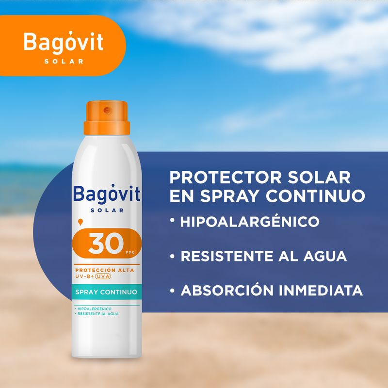 Bagóvit Solar en Spray Continuo con Factor de Protección Solar 30 es ideal para pieles muy sensibles a las quemaduras solares. Enriquecido con Vitamina E, antioxidante que protege las estructuras de la piel contribuyendo a reducir el fotoenvejecimiento y Aloe Vera, con efecto calmante y refrescante. El sistema de spray continuo multiposición 360° permite una fácil y rápida aplicación y gracias a su textura ultraliviana se esparce y se absorbe de manera inmediata sobre la piel. Amigable con el medio ambiente: este envase es inofensivo para la capa de ozono, funciona con tecnología exclusiva de aire comprimido. Es hipoalergénico y resistente al agua.