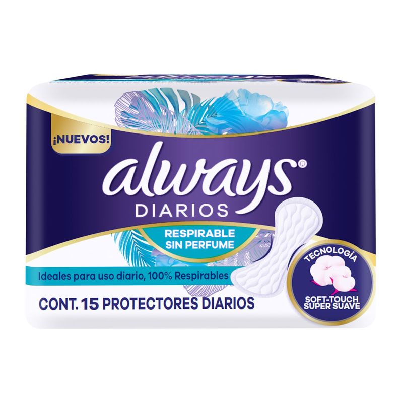 Always protectores diarios, te ayudarán a sentirte limpia y seca todos los días. Respirable, con una exclusiva tela microporosa que permite que el aire pase y tu piel respire naturalmente. Ideales para uso diario. Beneficios: - Ideales para uso diario. 100% Respirables. - Canales para una mejor absorción. - Adhesivo para que no se muevan. - Flujo moderado a intenso. - Fibras flexi absorbentes. Indicaciones: Remueve el papel detrás del protector y coloca el protector diario en su ropa interior presionando firmemente, sube tu ropa interior, en una cara de los empaques encontrarás unas ilustraciones con las instrucciones de uso y desecho. Advertencias: Si llegara a observar alguna reacción desfavorable, suspenda inmediatamente su uso, en caso de que persista consulte a su médico y al centro de atención al cliente.