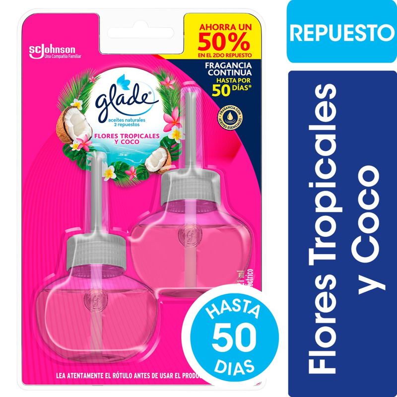 Creá un ambiente siempre perfumado con el relajante aroma a flores tropicales y coco de Tropical Floral Glade Aceites Naturales Repuesto Twinpack. AHORRAS UN 50% EN EL SEGUNDO REPUESTO. Ventajas: *Glade Aceites Naturales brinda una fragancia con una doble adaptación para aromatizar cualquier espacio, sin importar el tamaño. *El control de fragancias más avanzado brinda hasta 50 días del aroma continuo Creá tu propia experiencia de fragancia personalizada con el calentador Glade Aceites Naturales Customizables. El calentador te permite usar cualquiera de tus dos opciones preferidas de Glade Aceites Naturales Repuestos y alterna las fragancias a diario, lo que proporciona una intensa experiencia de fragancia uniforme. Instrucciones de Uso: *Si es necesario, gire el enchufe del aparato para hacerlo coincidir con el de la pared. *Desenrosque con cuidado la tapa de labotella evitando tocar la mecha con las manos. Para evitar derrames, siempre mantenga la botella en posición vertical durante el armado. Luego inserte la botella en el aparato hasta que encaje completamente. La botella estará correctamente instalada cuando sienta el “clic”. *Enchufe el aparato en posición vertical, de manera que la botella quede con la mecha hacia arriba. El aparato no funcionará correctamente si lo enchufa invertido o de costado. *Seleccione la intensidad deseada moviendo la palanquita que está en la parte superior del aparato. En el frente del aparato podrá ver la posición seleccionada: 1 (mínimo), 5 (máximo). Cuando la botella quede vacía, reemplácela por otro repuesto. *Instrucciones de Limpieza: Con el uso, pueden acumularse residuos de perfume en el aparato. Para limpiarlo, desenchúfelo y utilice un trapo seco para remover el residuo de perfume. Lávese las manos después de limpiarlo. IMPORTANTE: Si desenchufa el aparato, retire la botella y tápela.