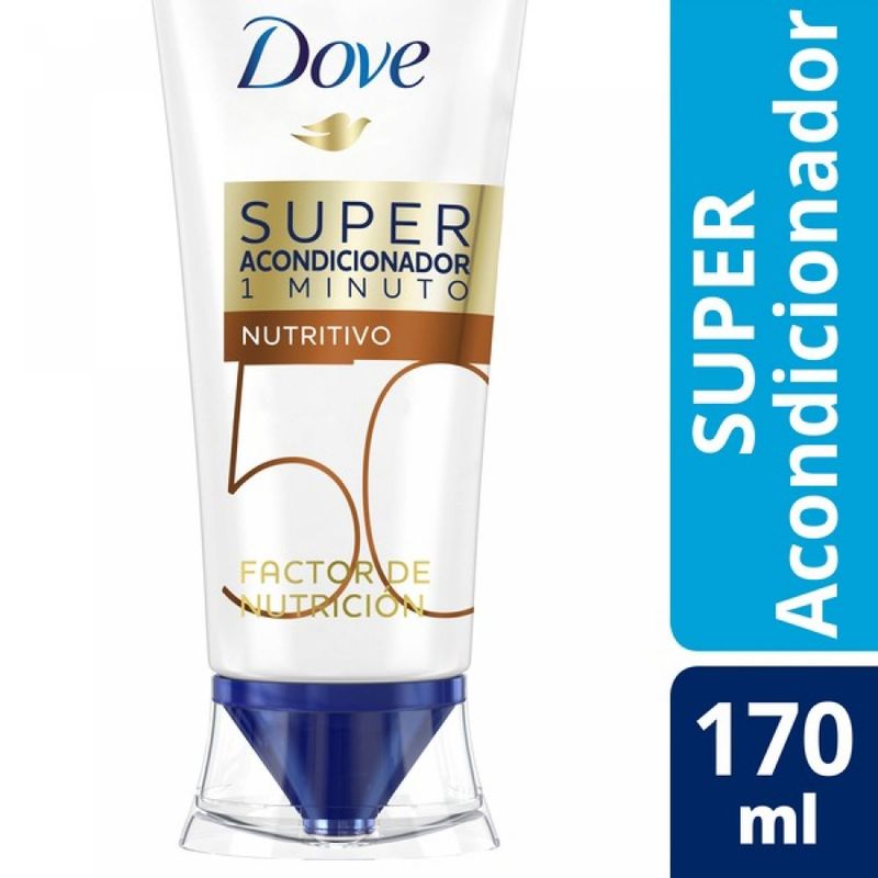 Super Acondicionador Dove 1 minuto con Factor de Nutrición. Un mix potente con nutrientes activos, cuidadosamente dosificados para alcanzar todos los requerimientos nutricionales diarios del cabellos para recuperarlo en sólo 1 minuto. El Factor de Nutrición 50 está diseñado para cabellos expuestos a las agresiones diarias del styling, tales como el uso de aparatos de calor (secador de pelo, rizador/buclera y plancha para el cabello).
