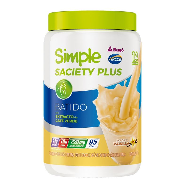 Simple Saciety Plus Batido es un suplemento dietario que aporta proteína y fibra para tener saciedad por más tiempo. Compuesto por proteína, fibra y extracto de café verde que proporcionan nutrientes esenciales de origen natural, ayudan a mejorar los hábitos saludables y así cuidar el peso corporal. Es el batido ideal entre las comidas, sabor vainilla y con tan solo 99 calorías.