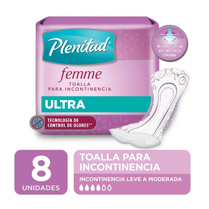 Toalla para perdidas abundantes de orina. Proteccion total. Absorbe hasta 235gr. Caracteristicas: *Mejor absorcion que la toalla femenina. *Tecnologia absorb loc: absorbe rapidamente y bloquea la orina manteniendo la piel seca. *Tecnologia de control de olores: absorbe y neutraliza olores. *Diseno anatomico y flexible para maxima comodidad y discrecion. *Barreras protectoras para prevenir desbordes. Modo de Uso: Desprender la cinta central de la toalla y adherir a la ropa interior.